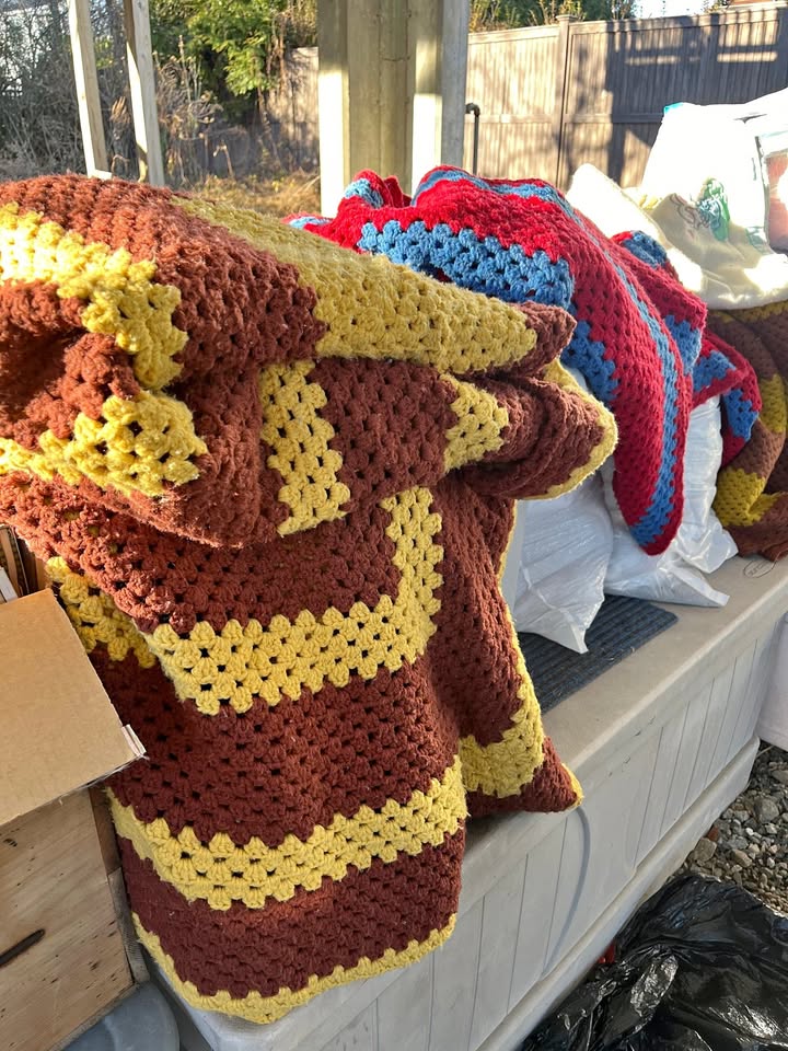 handmade quilts and a purple/yellow throw